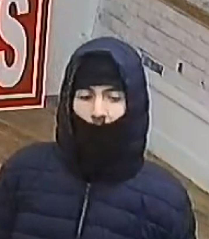 The second suspect is described as a white male, wearing a black face mask, black balaclava, blue jacket, black jeans, and black shoes.