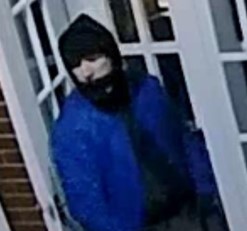 The suspect is described as a white male, clean-shaven, with an average build. At the time of the incident, he wore a black toque, blue jeans, and black Adidas shoes. The suspect appears to walk with a slight limp.