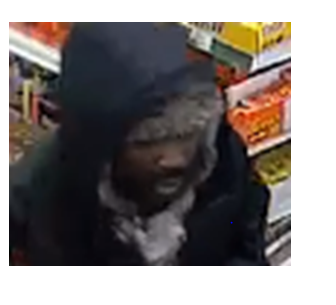 The suspect is described as a black male, approximately 35 years old, 6’2”, and 240lbs, with dark hair and a beard. At the time of the incident, the suspect wore a black hooded jacket, plaid hoodie, red gloves, blue jeans, and white shoes.
